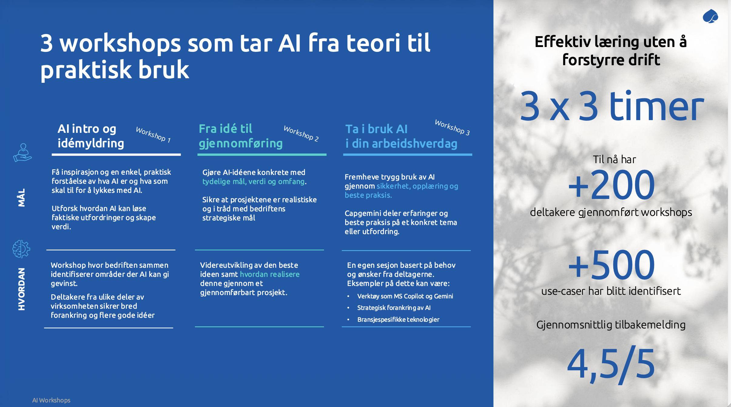 Ambisjon om å ta i bruk AI: Bedriften må ha en tydelig ambisjon om å ta AI i bruk i organisasjonen – enten for effektivisering, kvalitetsforbedring, innovasjon eller nye forretningsmuligheter. Workshopene er ikke ment som rene